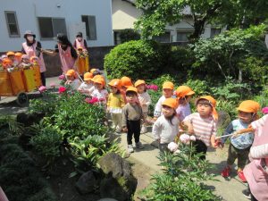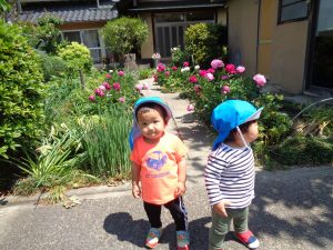 先日は、ご近所に咲いているきれいな芍薬のお花を見にお散歩に行ってきました。きれいなお花と一緒にハイポーズ。ポカポカお天気でウトウトしてしまったお友達もいました。