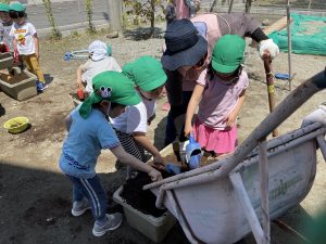 園庭遊びでは、お靴を履いて楽しむお友達も増えてきました。玄関の所にブルーシートを敷いて遊んでいると、お兄ちゃん&お姉ちゃん達が集まってきてくれて、一緒に遊んでくれています。とってもほほえましい光景です( ◠‿◠ )