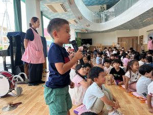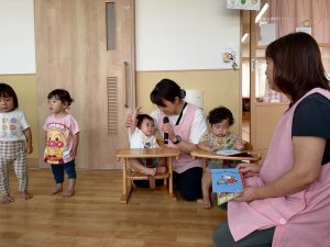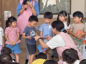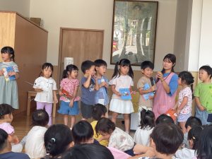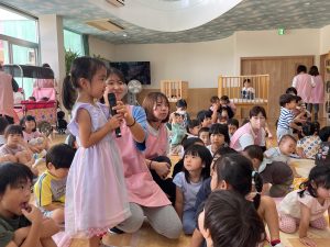 以上児さんは緊張しながらも、マイクを持って自分で発表を頑張りました。