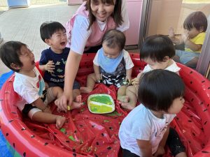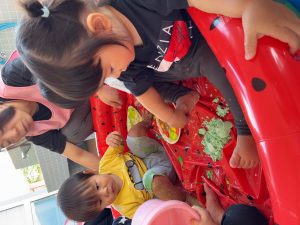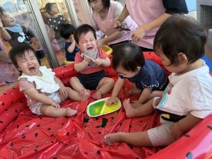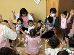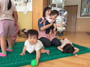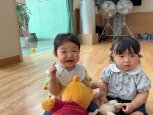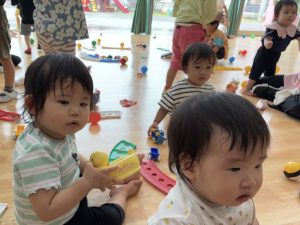 初めての遊びだったので泣いてしまうお友達もいたり…にぎにぎと意欲的に遊び始めるお友達もいたり楽しめていました。