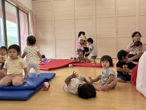 まずはホールでちゅーりっぷ組さんと一緒に遊んだ様子です!ボールを投げたりマットで体を動かしたりして遊びましたよ。