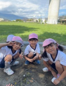 砂場では、どんぐりやお花、虫を見つけてお山に飾り付けをして楽しみました。
