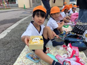 お昼は晴れていたので園庭でお弁当を食べました。仲の良いお友達と楽しくお話しながら愛情たっぷりの