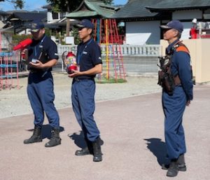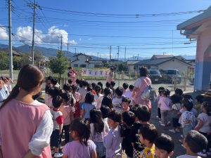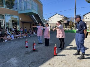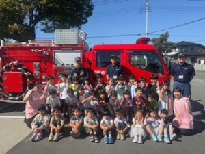 今回は甲府地区消防本部の消防士さんに来ていただき、全園児対象の避難訓練、