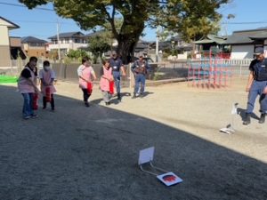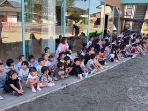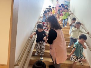 次に、防災ベルや放送を聞き、保育者の誘導の元、全園児が火元から遠いすずらん組前の