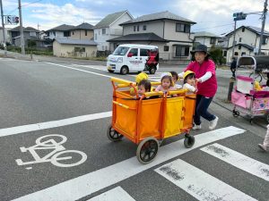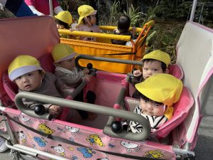 歩ける子は保育者と手をつなぎ、歩いたり、カートに乗って移動しました。