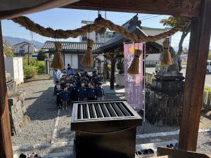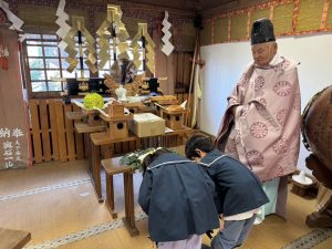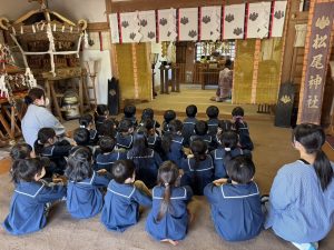 宮司さんの話を真剣に聞く姿が見られました。また、代表の園児2名が榊をお供えしてくれました。