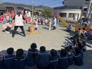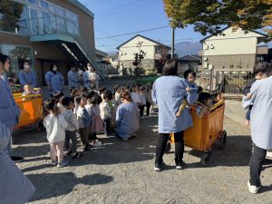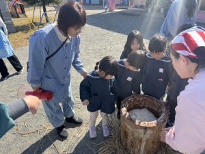 その後は園庭で餅つきです。年長児がお餅をついてくれました。