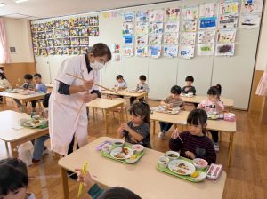 11月に入ってからお箸を使って給食を食べ始めました。今日は、栄養士の先生が正しい箸の持ち方を教えてくれました。