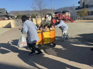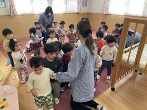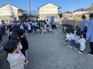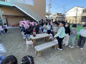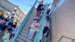 今月は、火災を想定し、訓練を行いました。普段とは違い時間が9:30~からと早い時間帯でまた、予告なしでしたが、12月となり、子ども達は慌てることもなく、放送をよく聞き、避難することができました。
