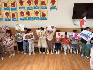 お休み中に凧に絵を描いてきてくれました!一生懸命描いた凧をみんなで飛ばしました!