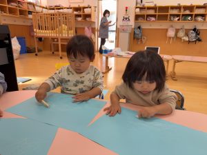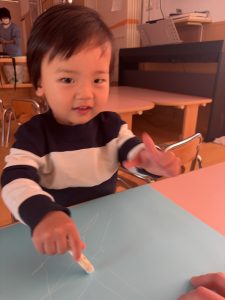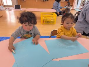 始めはクレヨンに警戒している子もいましたが、保育者と一緒に行うと、自分から手を動かし描き出していました。