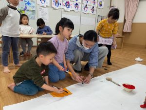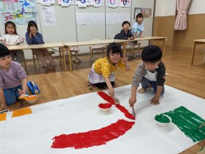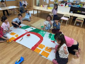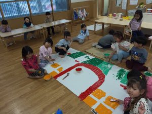 みんなで竜宮城の色塗りもしました。大きな竜宮城がきれいに塗れました。