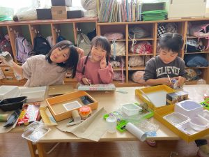 何回も廃材遊びをして、ハサミで切ったり、自分でテープを切ったり、