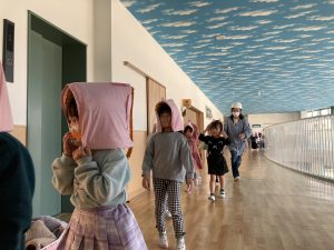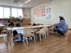 お昼寝直後の避難訓練でしたが、放送や保育者の話を落ち着いて聞き、身を守る姿勢をとることができました。