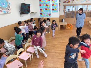 椅子取りゲームでは、勝ち負けを味わいながらも音楽に合わせて楽しく取り組んでいます。