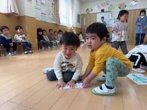 保育者の叩くリズムを真似っこしてた「タンタン」と言いながら叩く姿が見られました。
